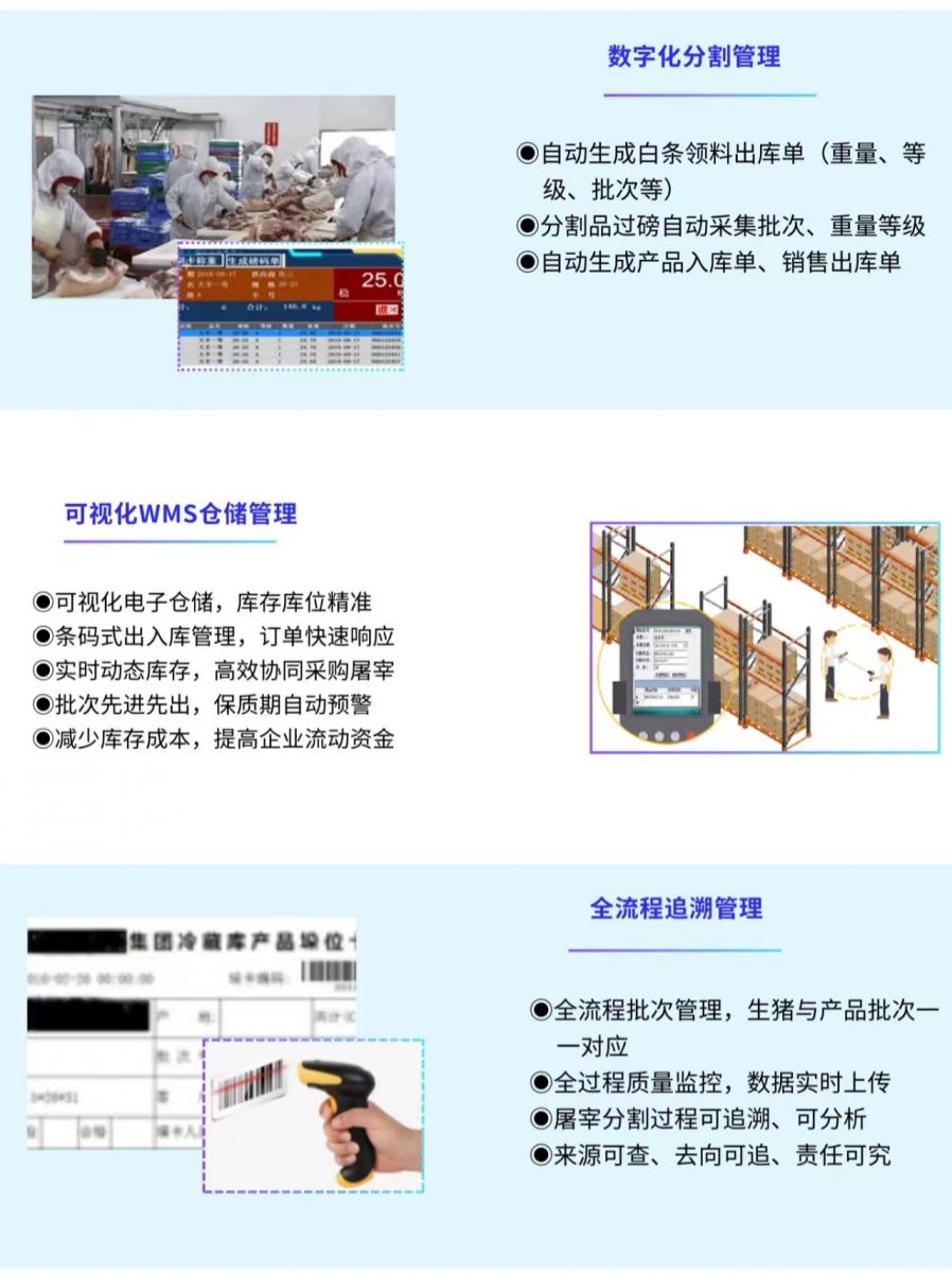 通過云存儲、物聯(lián)網(wǎng)、工業(yè)互聯(lián)網(wǎng)等技術(shù),對生豬采購、屠宰分割、倉儲配送所有環(huán)節(jié)進行信息化升級,實現(xiàn)采購結(jié)算透明化、屠宰分割最優(yōu)化、生產(chǎn)排產(chǎn)智能化、車間管理數(shù)字化、倉儲管理可視化、業(yè)務(wù)財務(wù)一體化等管理目標。